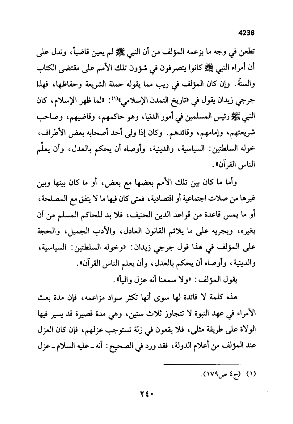 تطعن في وجه ما يزعمه المؤلف من أن النبي - صلى الله عليه وسلم - لم يعين قاضياً، وتدل على أن أمراء النبي - صلى الله عليه وسلم - كانوا يتصرفون في شؤون تلك الأمم على مقتضى الكتاب والسنة. وإن كان المؤلف في ريب مما يقوله حملة الشريعة وحفاظها، فهذا جرجي زيدان يقول في "تاريخ التمدن الإسلامي" (¬1): "لما ظهر الإسلام، كان النبي - صلى الله عليه وسلم - رئيس المسلمين في أمور الدنيا، وهو حاكمهم، وقاضيهم، وصاحب شريعتهم، وإمامهم، وقائدهم. وكان إذا ولى أحد أصحابه بعض الأطراف، خوله السلطتين: السياسية، والدينية، وأوصاه أن يحكم بالعدل، وأن يعلِّم الناس القرآن".