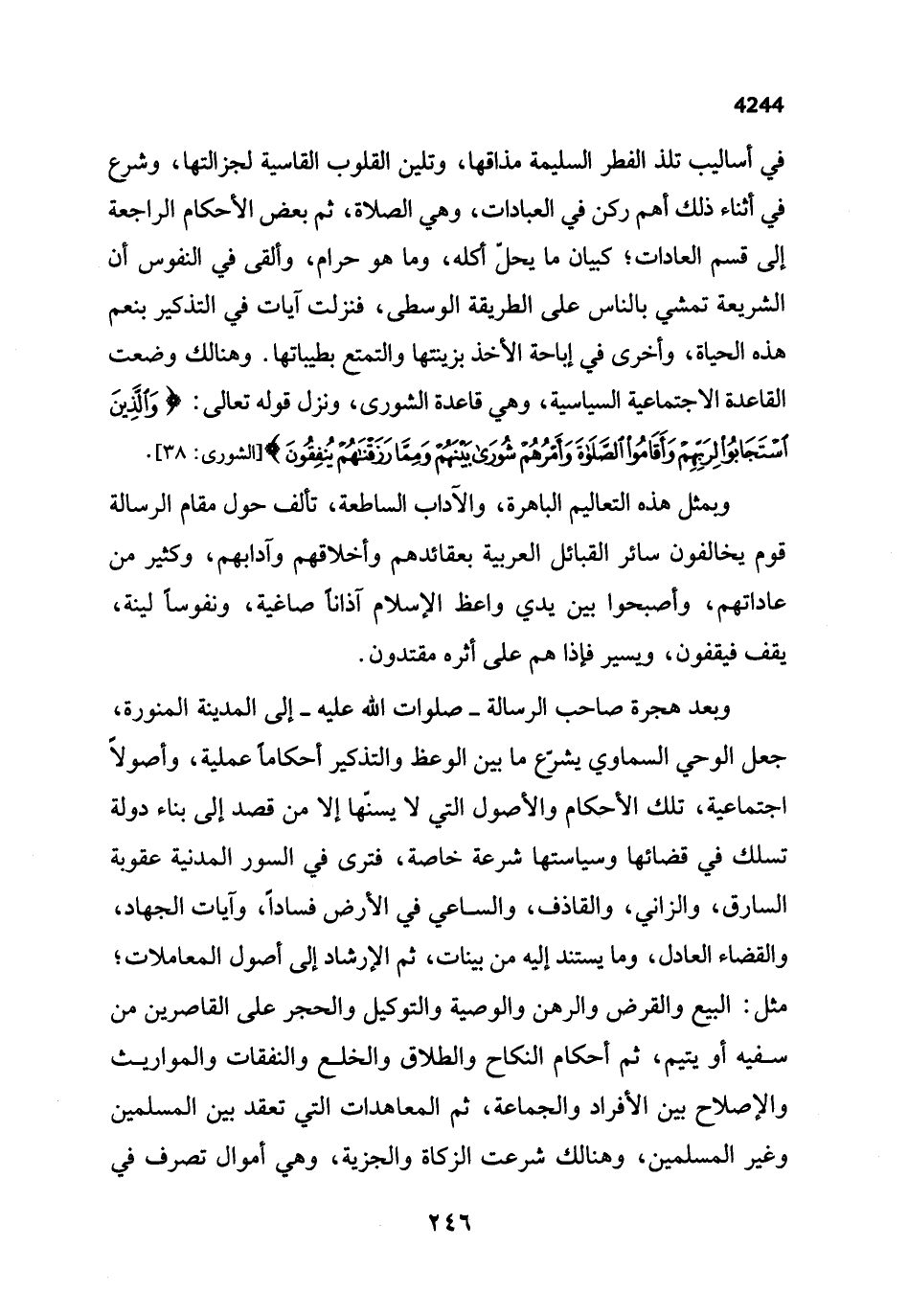 ويعد هجرة صاحب الرسالة - صلوات الله عليه - إلى المدينة المنورة، جعل الوحي السماوي يشرّع ما بين الوعظ والتذكير أحكاماً عملية، وأصولاً اجتماعية، تلك الأحكام والأصول التي لا يسنّها إلا من قصد إلى بناء دولة تسلك في قضائها وسياستها شرعة خاصة، فترى في السور المدنية عقوبة السارق، والزاني، والقاذف، والساعي في الأرض فساداً، وآيات الجهاد، والقضاء العادل، وما يستند إليه من بينات، ثم الإرشاد إلى أصول المعاملات؛ مثل: البيع والقرض والرهن والوصية والتوكيل والحجر على القاصرين من سفيه أو يتيم، ثم أحكام النكاح والطلاق والخلع والنفقات والمواريث والإصلاح بين الأفراد والجماعة، ثم المعاهدات التي تعقد بين المسلمين وغير المسلمين، وهنالك شرعت الزكاة والجزية، وهي أموال تصرف في