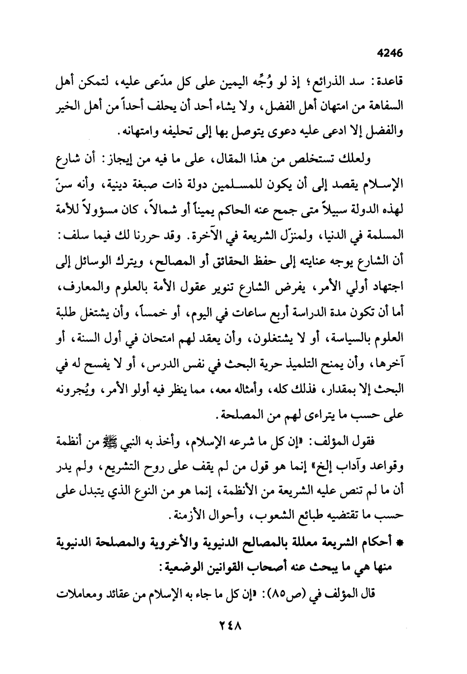 فقول المؤلف: "إن كل ما شرعه الإسلام، وأخذ به النبي - صلى الله عليه وسلم - من أنظمة وقواعد وآداب إلخ" إنما هو قول من لم يقف على روح التشريع، ولم يدر أن ما لم تنص عليه الشريعة من الأنظمة، إنما هو من النوع الذي يتبدل على حسب ما تقتضيه طبائع الشعوب، وأحوال الأزمنة.