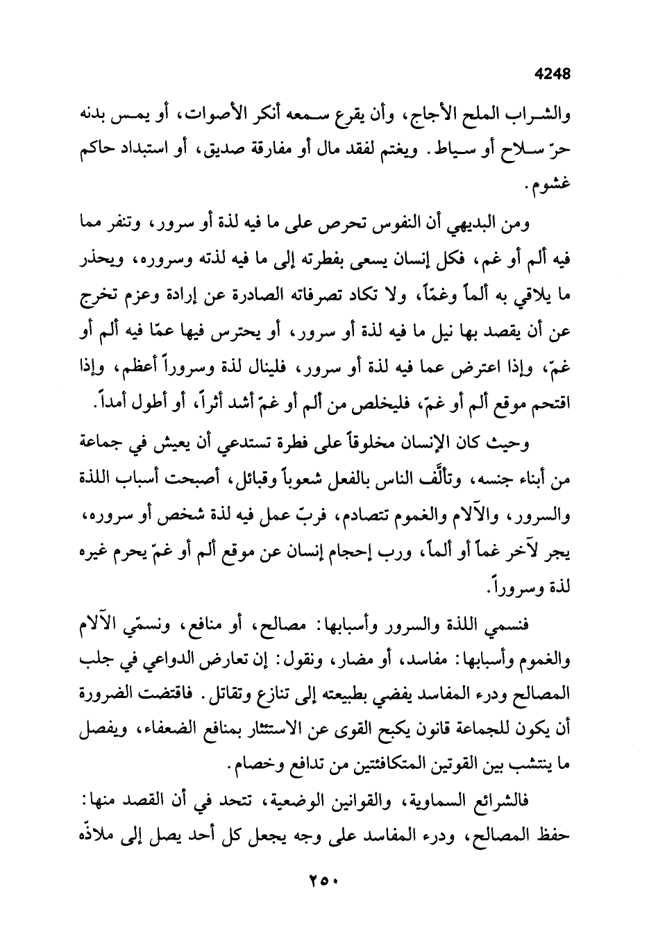 فنسمي اللذة والسرور وأسبابها: مصالح، أو منافع، ونسمّي الآلام والغموم وأسبابها: مفاسد، أو مضار، ونقول: إن تعارض الدواعي في جلب المصالح ودرء المفاسد يفضي بطبيعته إلى تنازع وتقاتل. فاقتضت الضرورة أن يكون للجماعة قانون يكبح القوى عن الاستئثار بمنافع الضعفاء، ويفصل ما ينتشب بين القوتين المتكافئتين من تدافع وخصام.