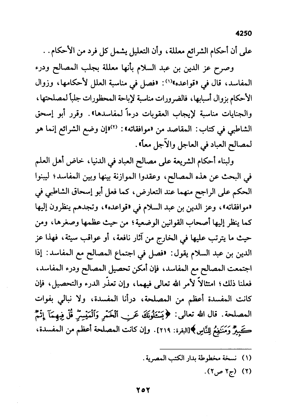 وصرح عز الدين بن عبد السلام بأنها معللة بجلب المصالح ودرء المفاسد، قال في "قواعده" (¬1): "فصل في مناسبة العلل لأحكامها، وزوال الأحكام بزوال أسبابها، فالضرورات مناسبة لأباحة المحظورات جلباً لمصلحتها، والجنايات مناسبة لإيجاب العقوبات درءاً لمفاسدها". وقرر أبو إسحق الشاطبي في كتاب: المقاصد من "موافقاته": (¬2) "إن وضع الشرائع إنما هو لمصالح العباد في العاجل والآجل معاً".