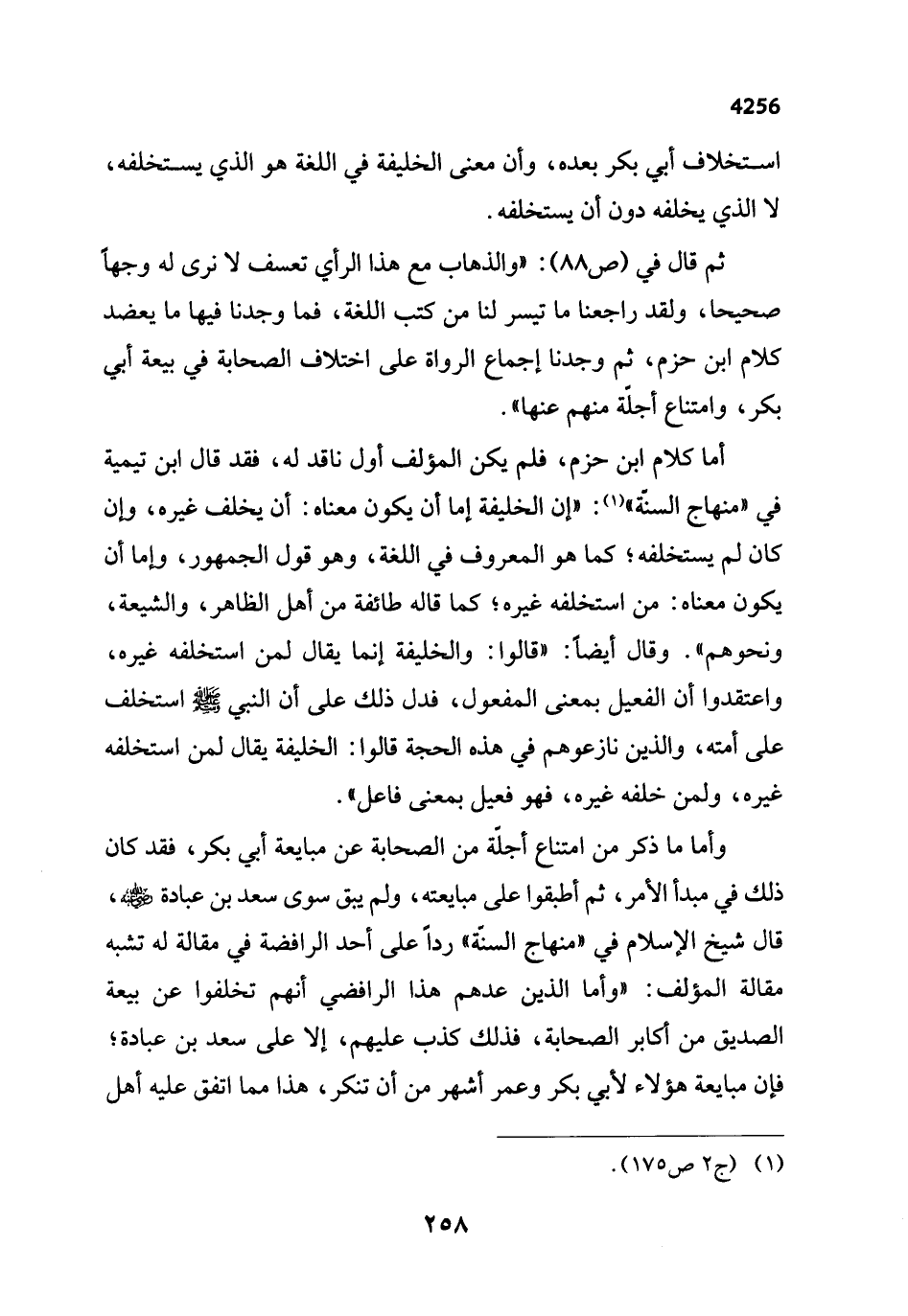 ثم قال في (ص 88): "والذهاب مع هذا الرأي تعسف لا نرى له وجهاً صحيحا، ولقد راجعنا ما تيسر لنا من كتب اللغة، فما وجدنا فيها ما يعضد كلام ابن حزم، ثم وجدنا إجماع الرواة على اختلاف الصحابة في بيعة أبي بكر، وامتناع أجلّة منهم عنها".