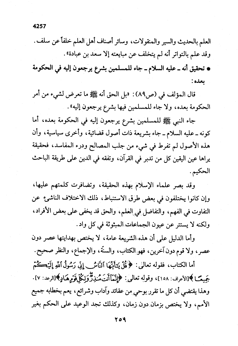 وأما الدليل على أن هذه الشريعة عامة، لا يختص بهدايتها عصر دون عصر، ولا قوم دون آخرين، فهو الكتاب، والسنّة، والإجماع، والنظر صحيح. أما الكتاب، فقوله تعالى: {قُلْ يَا أَيُّهَا النَّاسُ إِنِّي رَسُولُ اللَّهِ إِلَيْكُمْ جَمِيعًا} [الأعراف: 158]، وقوله تعالى. {إِنَّمَا أَنْتَ مُنْذِرٌ وَلِكُلِّ قَوْمٍ هَادٍ} [الرعد: 7]. وهذا يقتضي أن كل ما تقرر بوحي من عقائد وآداب وشرائع، يعم بخطابه جميع الأمم، ولا يختص بزمان, دون زمان، وكذلك تجد الوعيد على الحكم بغير