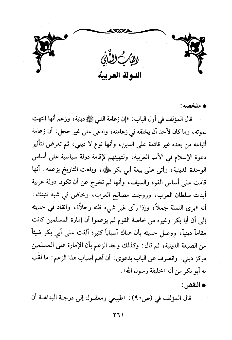 قال المؤلف في أول الباب: "إن زعامة النبي - صلى الله عليه وسلم - دينية، وزعم أنها انتهت بموته، وما كان لأحد أن يخلفه في زعامته، وادعى على غير خجل: أن زعامة أتباعه من بعده غير قائمة على الدين، وأنها نوع لا ديني، ثم تعرض لتأثير دعوة الإسلام في الأمم العربية، ولتهيئهم لإقامة دولة سياسية على أساس الوحدة الدينية، وأتى على بيعة أبي بكر - رضي الله عنه -، وباهت التاريخ بزعمه: أنها قامت على أساس القوة والسيف، وأنها لم تخرج عن أن تكون دولة عربية أيدت سلطان العرب، وروجت مصالح العرب، وخاض في شبه تنبئك: أنه "يرى النملة جملاً، وإذا رأى غير شيء ظنه رجلاً "، وانقاد في حديثه إلى أن أبا بكر وغيره من خاصة القوم لم يزعموا أن إمارة المسلمين كانت مقاماً دينياً، ووصل حديثه بأن هناك أسباباً كثيرة ألقت على أبي بكر شيئاً من الصبغة الدينية، ثم قال: وكذلك وجد الزعم بأن الإمارة على المسلمين مركز ديني. وانصرف عن الباب بدعوى: أن أهم أسباب هذا الزعم: ما لقّب به أبو بكر من أنه "خليفة رسول الله".