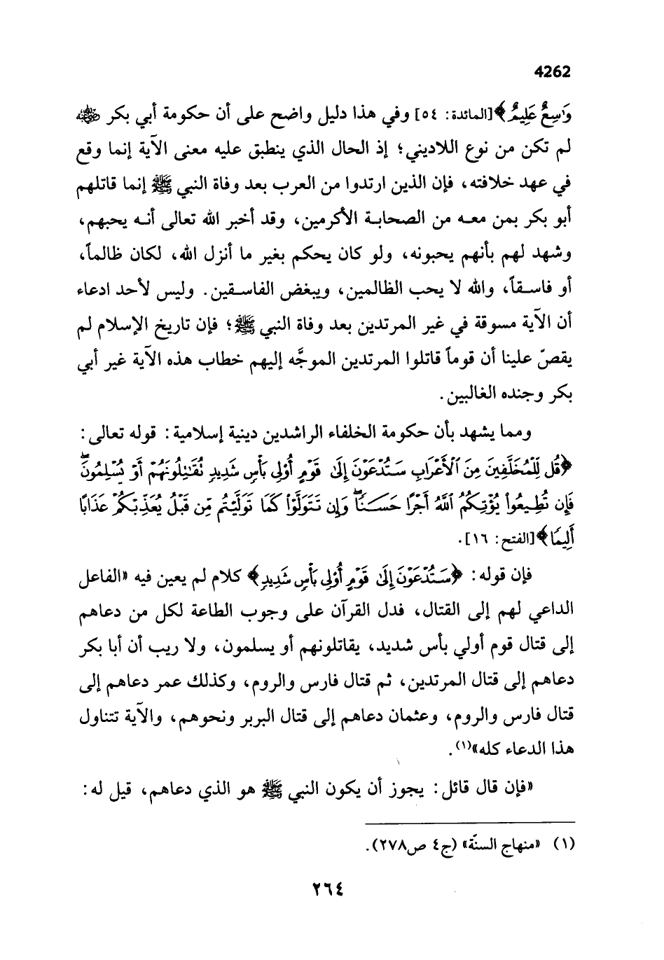 وَاسِعٌ عَلِيمٌ} [المائدة: 54]، وفي هذا دليل واضح على أن حكومة أبي بكر - رضي الله عنه - لم تكن من نوع اللاديني؛ إذ الحال الذي ينطبق عليه معنى الآية إنما وقع في عهد خلافته، فإن الذين ارتدوا من العرب بعد وفاة النبي - صلى الله عليه وسلم - إنما قاتلهم أبو بكر بمن معه من الصحابة الأكرمين، وقد أخبر الله تعالى أنه يحبهم، وشهد لهم بأنهم يحبونه، ولو كان يحكم بغير ما أنزل الله، لكان ظالماً، أو فاسقاً، والله لا يحب الظالمين، ويبغض الفاسقين. وليس لأحد ادعاء أن الآية مسوقة في غير المرتدين بعد وفاة النبي - صلى الله عليه وسلم -؛ فإن تاريخ الإسلام لم يقصّ علينا أن قوماً قاتلوا المرتدين الموجَّه إليهم خطاب هذه الآية غير أبي بكر وجنده الغالبين.