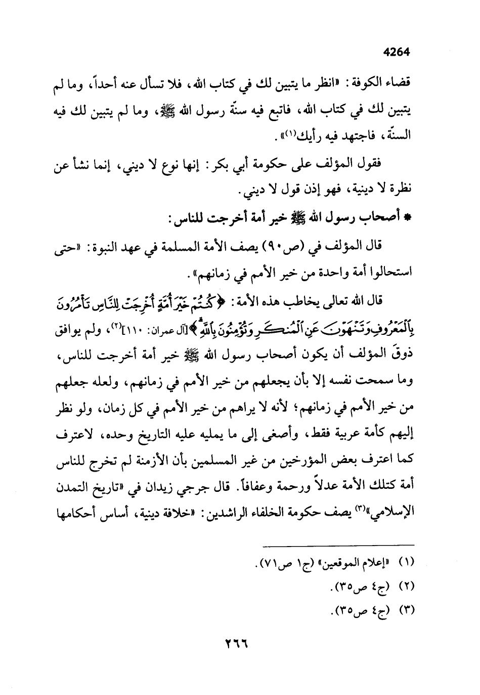 قال الثه تعالى يخاطب هذه الأمة: {كُنْتُمْ خَيْرَ أُمَّةٍ أُخْرِجَتْ لِلنَّاسِ تَأْمُرُونَ بِالْمَعْرُوفِ وَتَنْهَوْنَ عَنِ الْمُنْكَرِ وَتُؤْمِنُونَ بِاللَّهِ} [آل عمران: 110] (¬2)، ولم يوافق ذوقَ المؤلف أن يكون أصحاب رسول الله - صلى الله عليه وسلم - خير أمة أخرجت للناس، وما سمحت نفسه إلا بأن يجعلهم من خير الأمم في زمانهم، ولعله جعلهم من خير الأمم في زمانهم؛ لأنه لا يراهم من خير الأمم في كل زمان، ولو نظر إليهم كأمة عربية فقط، وأصغى إلى ما يمليه عليه التاريخ وحده، لاعترف كما اعترف بعض المؤرخين من غير المسلمين بأن الأزمنة لم تخرج للناس أمة كتلك الأمة عدلاً ورحمة وعفافاً. قال جرجي زيدان في "تاريخ التمدن الإسلامي" (¬3) يصف حكومة الخلفاء الراشدين: "خلافة دينية، أساس أحكامها