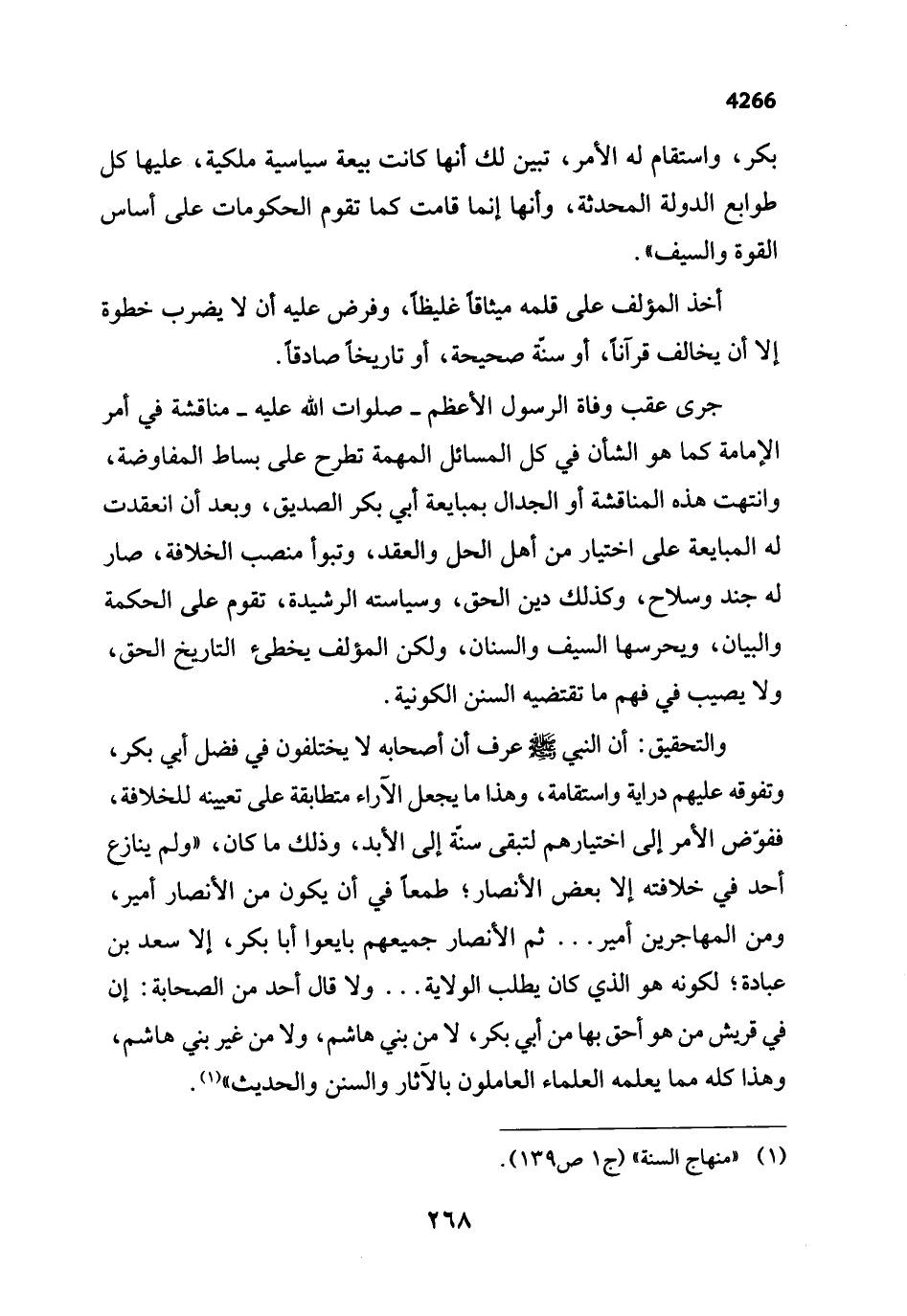 جرى عقب وفاة الرسول الأعظم - صلوات الله عليه - مناقشة في أمر الإمامة كما هو الشأن في كل المسائل المهمة تطرح على بساط المفاوضة، وانتهت هذه المناقشة أو الجدال بمبايعة أبي بكر الصديق، وبعد أن انعقدت له المبايعة على اختيار من أهل الحل والعقد، وتبوأ منصب الخلافة، صار له جند وسلاح، وكذلك دين الحق، وسياسته الرشيدة، تقوم على الحكمة والبيان، ويحرسها السيف والسنان، ولكن المؤلف يخطئ التاريخ الحق، ولا يصيب في فهم ما تقتضيه السنن الكونية.