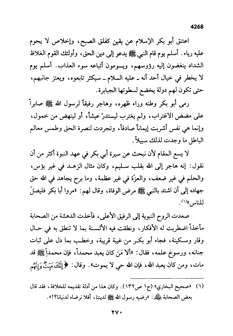 اعتنق أبو بكر الإسلام عن يقين كفلق الصبح، وإخلاص لا يحوم عليه رياء. أسلم يوم قام النبي - صلى الله عليه وسلم - يدعو إلى دين الحق، وأولئك القوم الغلاظ الشداد ينغضون إليه رؤوسهم، ويسومون أتباعه سوء العذاب. أسلم يوم لا يخطر في خيال أحد أنه - عليه السلام - سيكثر تابعوه، ويعتز جانبهم، حتى تكون لهم دولة يخضع لسطوتها الجبابرة.