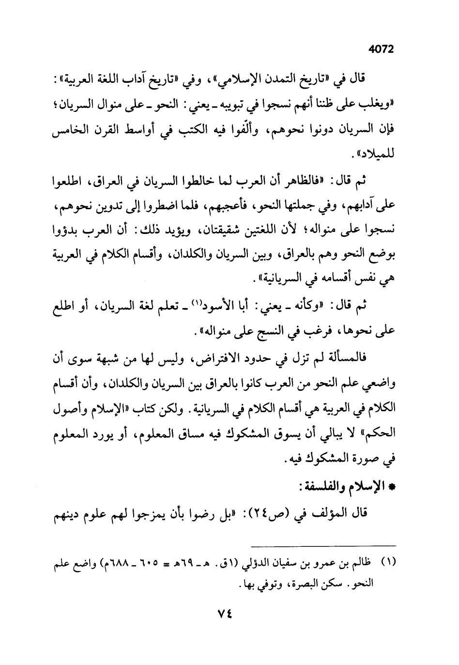 فالمسألة لم تزل في حدود الافتراض، وليس لها من شبهة سوى أن واضعي علم النحو من العرب كانوا بالعراق بين السريان والكلدان، وأن أقسام الكلام في العربية هي أقسام الكلام في السريانية. ولكن كتاب "الإسلام وأصول الحكم، لا يبالي أن يسوق المشكوك فيه مساق المعلوم، أو يورد المعلوم في صورة المشكوك فيه.