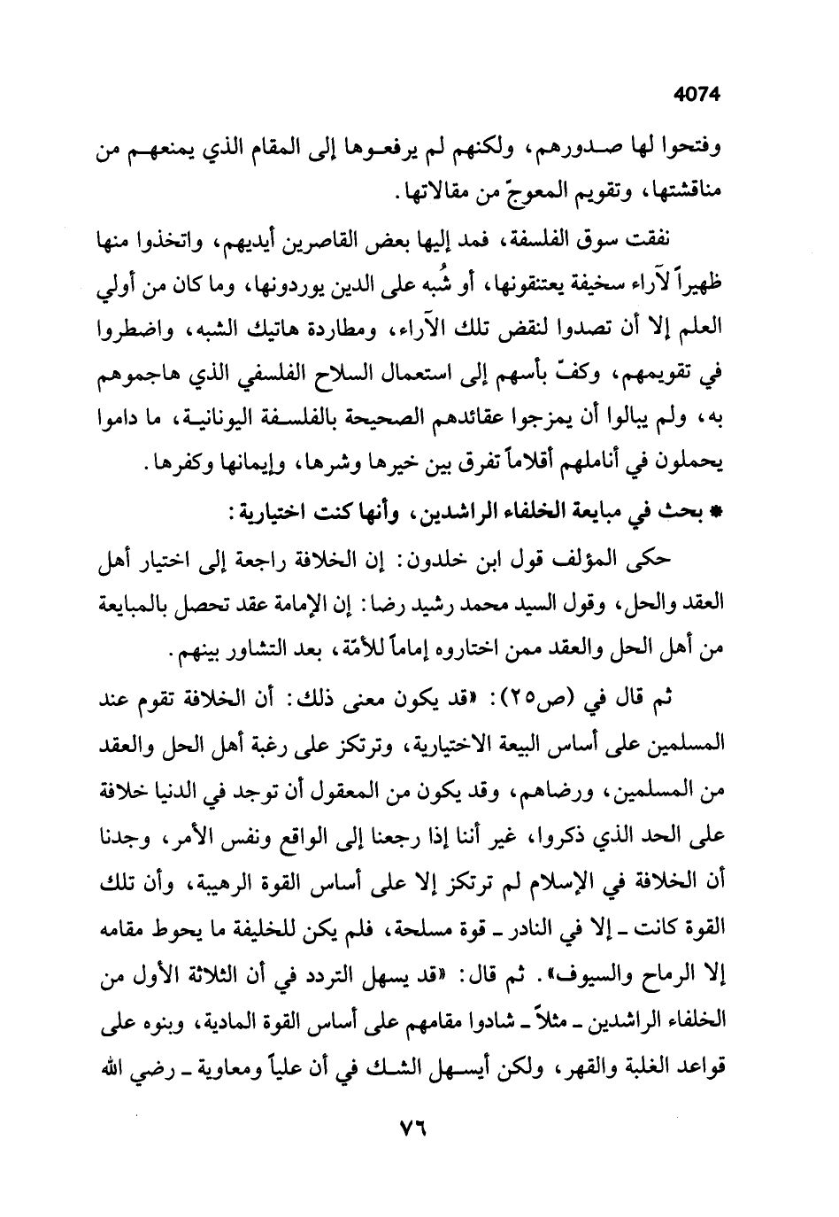 حكى المؤلف قول ابن خلدون: إن الخلافة راجعة إلى اختيار أهل العقد والحل، وقول السيد محمد رشيد رضا: إن الإمامة عقد تحصل بالمبايعة من أهل الحل والعقد ممن اختاروه إماماً للأمّة، بعد التشاور بينهم.