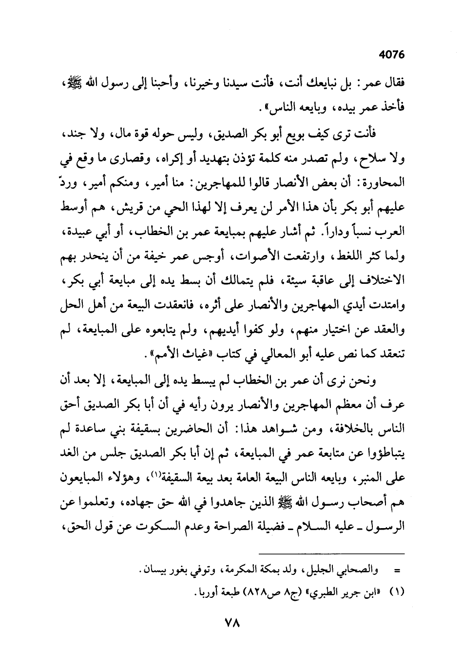 فأنت ترى كيف بويع أبو بكر الصديق، وليس حوله قوة مال، ولا جند، ولا سلاح، ولم تصدر منه كلمة تؤذن بتهديد أو إكراه، وقصارى ما وقع في المحاورة: أن بعض الأنصار قالوا للمهاجرين: منا أمير، ومنكم أمير، وردّ عليهم أبو بكر بأن هذا الأمر لن يعرف إلا لهذا الحي من قريش، هم أوسط العرب نسباً وداراً. ثم أشار عليهم بمبايعة عمر بن الخطاب، أو أبي عبيدة، ولما أكثر اللغط، وارتفعت الأصوات، أوجس عمر خيفة من أن ينحدر بهم الاختلاف إلى عاقبة سيئة، فلم يتمالك أن بسط يده إلى مبايعة أبي بكر، وامتدت أيدي المهاجرين والأنصار على أثره، فانعقدت البيعة من أهل الحل والعقد عن اختيار منهم، ولو كفوا أيديهم، ولم يتابعوه على المبايعة، لم تنعقد كما نص عليه أبو المعالي في كتاب "غياث الأمم".