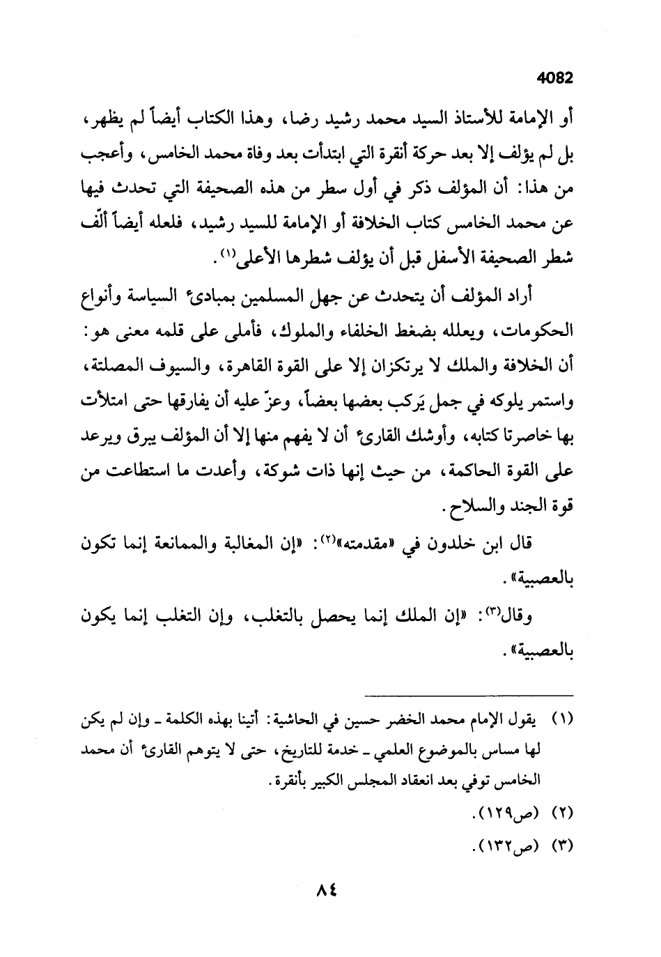 أو الأمامة للأستاذ السيد محمد رشيد رضا، وهذا الكتاب أيضاً لم يظهر، بل لم يؤلف إلا بعد حركة أنقرة التي ابتدأت بعد وفاة محمد الخامس، وأعجب من هذا: أن المؤلف ذكر في أول سطر من هذه الصحيفة التي تحدث فيها عن محمد الخامس كتاب الخلافة أو الإمامة للسيد رشيد، فلعله أيضاً ألّف شطر الصحيفة الأسفل قبل أن يؤلف شطرها الأعلى (¬1).