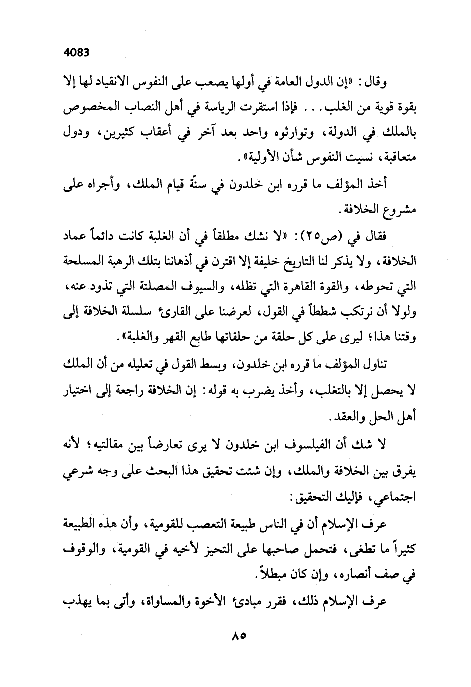 أخذ المؤلف ما قرره ابن خلدون في سنّة قيام الملك، وأجراه على مشروع الخلافة.