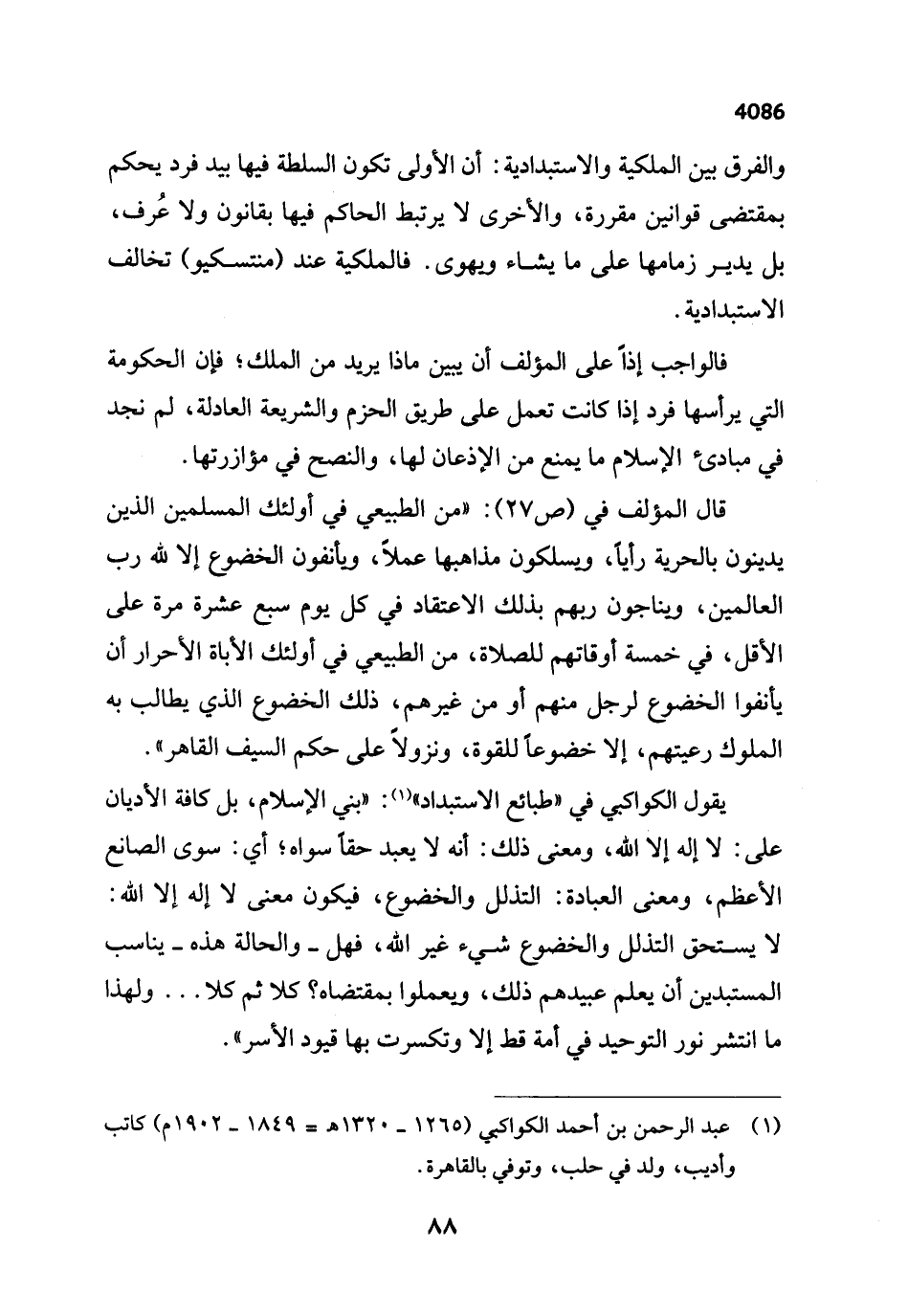 قال المؤلف في (ص 27): "من الطبيعي في أولئك المسلمين الذين يدينون بالحرية رأياً، وشملكون مذاهبها عملاً، ويأنفون الخضوع إلا لله رب العالمين، ويناجون ربهم بذلك الاعتقاد في كل يوم سبع عشرة مرة على الأقل، في خمسة أوقاتهم للصلاة، من الطبيعي في أولئك الأباة الأحرار أن يأنفوا الخضوع لرجل منهم أو من غيرهم، ذلك الخضوع الذي يطالب به الملوك رعيتهم، إلا خضوعاً للقوة، ونزولاً على حكم السيف القاهر".
