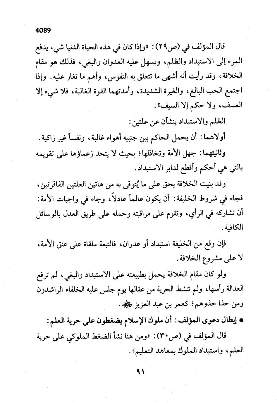 ولو كان مقام الخلافة يحمل بطبيعته على الاستبداد والبغي، لم ترفع العدالة رأسها، ولم تنشط الحرية من عقالها يوم جلس عليه الخلفاء الراشدون ومن حذا حذوهم؛ كعمر بن عبد العزيز - رضي الله عنه -.