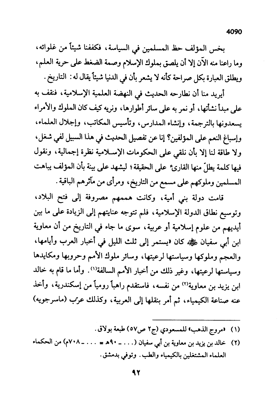 أيريد منا أن نطارحه الحديث في النهضة العلمية الإسلامية، فنقف به على مبدأ نشأتها، أو نمر به على سائر أطوارها، ونريه كيف كان الملوك والأمراء يسعدونها بالترجمة، وإنشاء المدارس، وتأسيس المكاتب، وإجلال العلماء، وإسباغ النعم على المؤلفين؟ إنا عن تفصيل الحديث في هذا السبيل لفي شغل، ولا طاقة لنا إلا بأن نلقي على الحكومات الإسلامية نظرة إجمالية، ونقول فيها كلمة يطلّ منها القارئ على الحقيقة؛ ليشهد على بينة بأن المؤلف يباهت المسلمين وملوكهم على مسمع من التاريخ، ومرأى من مآثرهم الباقية.