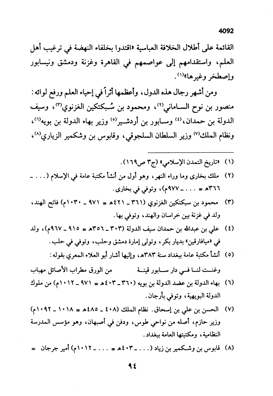 ومن أشهر رجال هذه الدول، وأعظمها أثراً في إحياء العلم ورفع لوائه: منصور بن نوح الساماني (¬2)، ومحمود بن سُبكتكين الغزنوي (¬3)، وسيف الدولة بن حمدان، (¬4) وسابور بن أردشير (¬5) وزير بهاء الدولة بن بويه (¬6)، ونظام الملك (¬7) وزير السلطان السلجوقي، وقابوس بن وشكمير الزياري (¬8)،