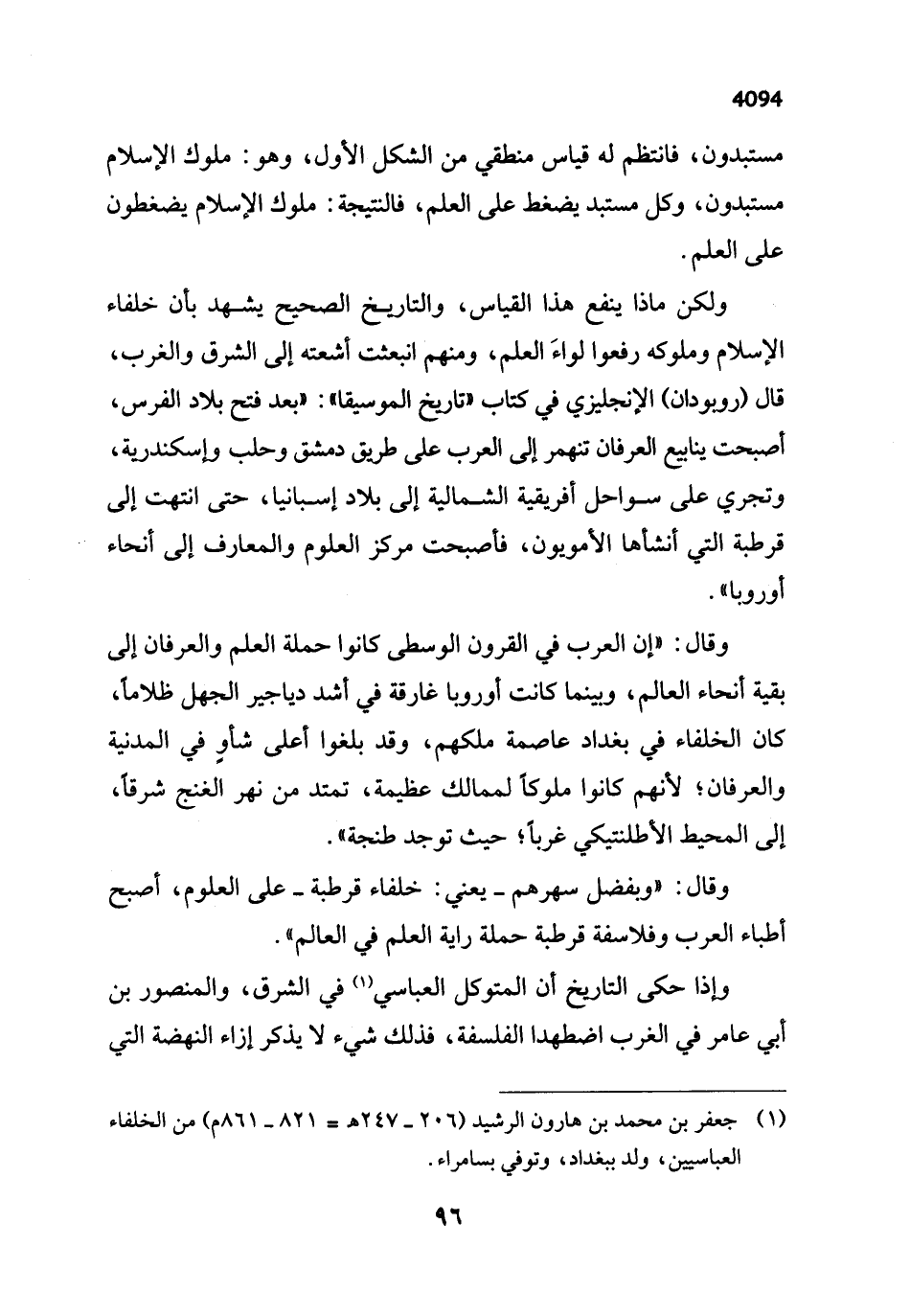 ولكن ماذا ينفع هذا القياس، والتاريخ الصحيح يشهد بأن خلفاء الإسلام وملوكه رفعوا لواءَ العلم، ومنهم انبعثت أشعته إلى الشرق والغرب، قال (رويودان) الإنجليزي في كتاب "تاريخ الموسيقا": "بعد فتح بلاد الفرس، أصبحت ينابيع العرفان تنهمر إلى العرب على طريق دمشق وحلب وإسكندرية، وتجري على سواحل أفريقية الشمالية إلى بلاد إسبانيا، حتى انتهت إلى قرطبة التي أنشاها الأمويون، فأصبحت مركز العلوم والمعارف إلى أنحاء أوروبا".