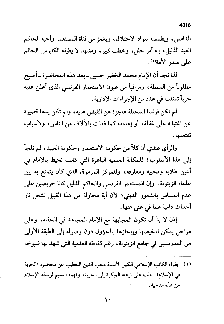 لذا نجد أن الإمام محمد الخضر حسين - بعد هذه المحاضرة - أصبح مطلوباً من السلطة، ومراقباً من عيون الاستعمار الفرنسي الذي أعلن عليه حرباً تمثلت في عدد من الإجراءات الإدارية.
