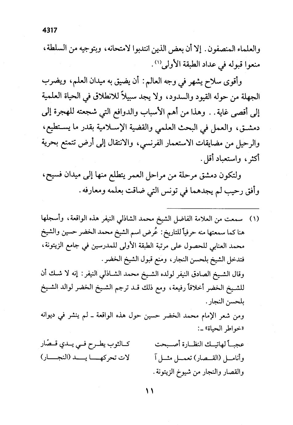 وأقوى سلاح يشهر في وجه العالم: أن يضيق به ميدان العلم، ويضرب الجهلة من حوله القيود والسدود، ولا يجد سبيلاً للانطلاق في الحياة العلمية إلى أقصى غاية .. وهذا من أهم الأسباب والدوافع التي شجعته للهجرة إلى دمشق، والعمل في البحث العلّمي والقضية الإسلامية بقدر ما يستطيع، والرحيل من مضايقات الاستعمار الفرنسي، والانتقال إلى أرض تتمتع بحرية أكثر، واستعباد أقل.