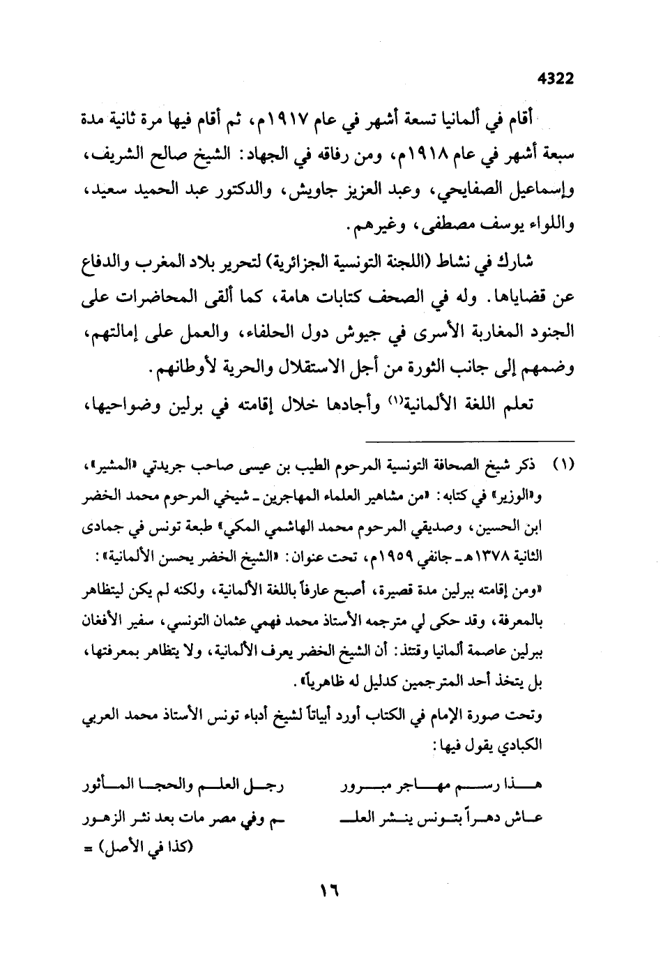 وتحت صورة الإمام في الكتاب أورد أبياتاً لشيخ أدباء تونس الأستاذ محمد العربي الكبادي يقول فيها: