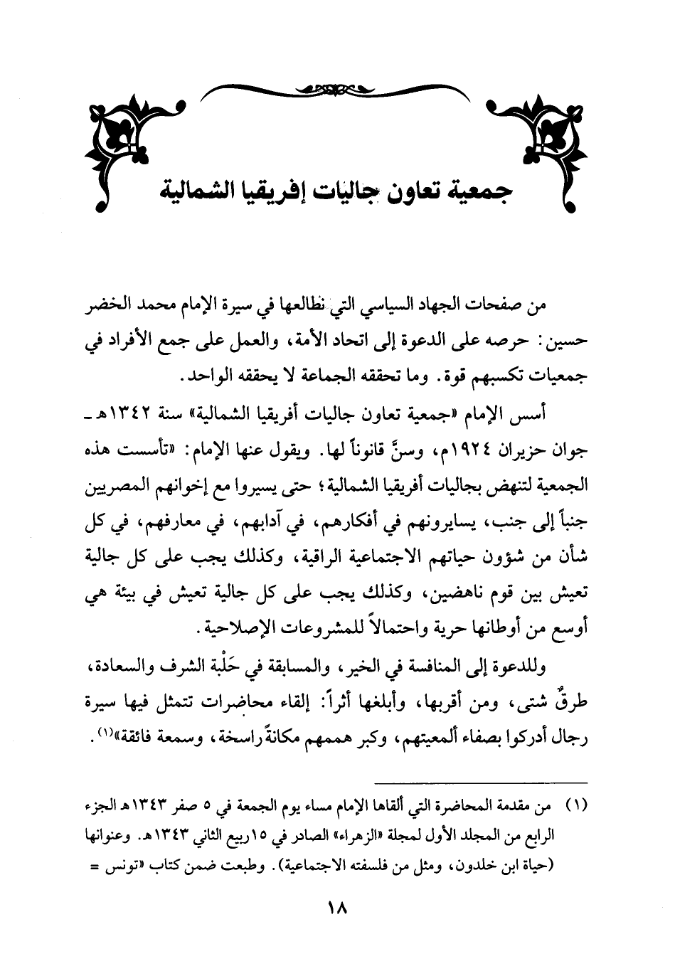 من صفحات الجهاد السياسي التي نطالعها في سيرة الإمام محمد الخضر حسين: حرصه على الدعوة إلى اتحاد الأمة، والعمل على جمع الأفراد في جمعيات تكسبهم قوة. وما تحققه الجماعة لا يحققه الواحد.