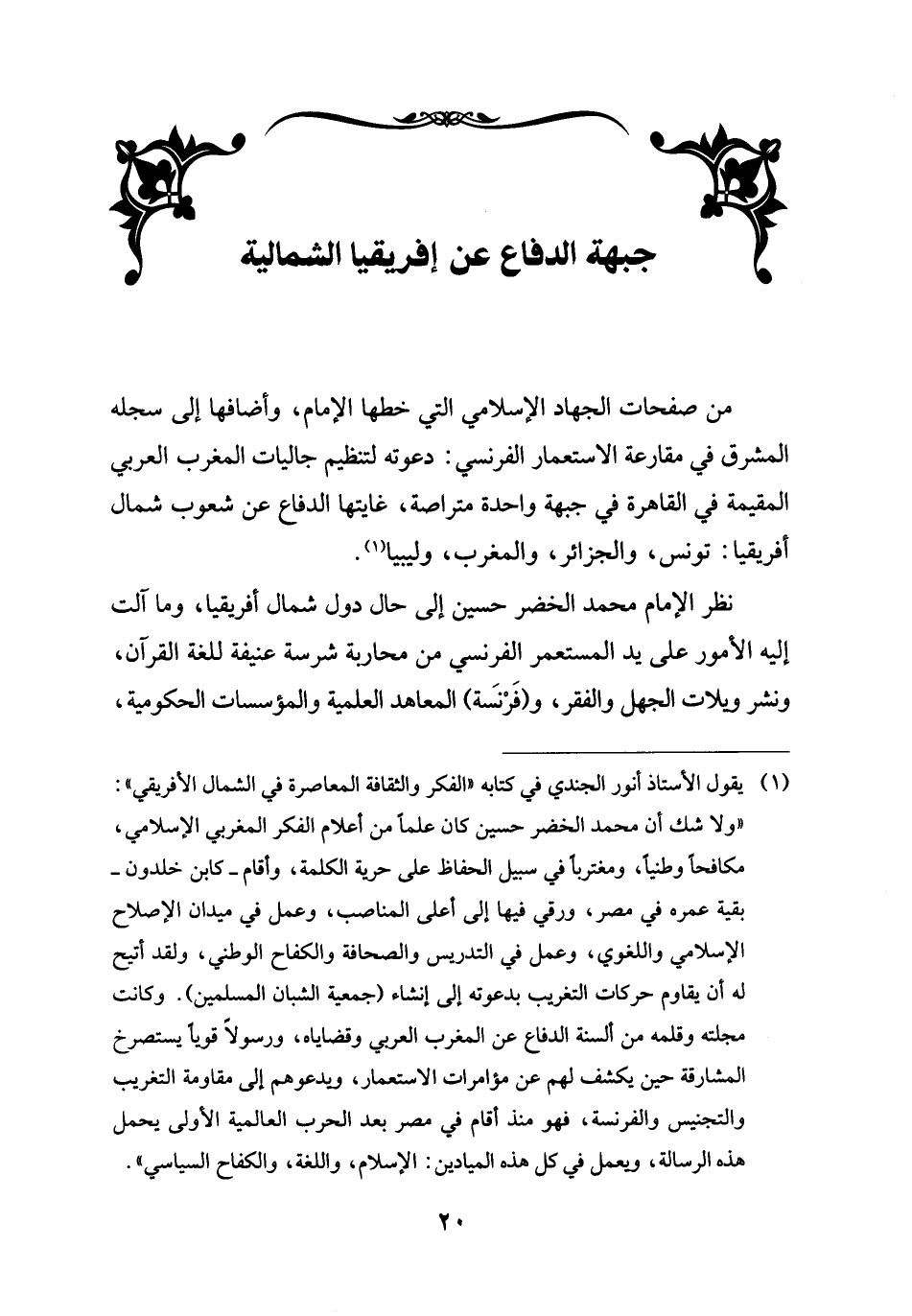 (¬1) يقول الأستاذ أنور الجندي في كتابه "الفكر والثقافة المعاصرة في الشمال الأفريقي": "ولا شك أن محمد الخضر حسين كان علماً من أعلام الفكر المغربي الإسلامي، مكافحاً وطنياً، ومغترباً في سبيل الحفاظ على حرية الكلمة، وأقام -كابن خلدون- بقية عمره في مصر، وررقي فيها إلى أعلى المناصب، وعمل في ميدان الإصلاح الإسلامي واللغوي، وعمل في التدريس والصحافة والكفاح الوطني، ولقد أتيح له أن يقاوم حركات التغريب بدعوته إلى إنشاء (جمعية الشبان المسلمين). وكانت مجلته وقلمه من ألسنة الدفاع عن المغرب العربي وقضاياه، ورسولًا قويا يستصرخ المشارقة حين يكشف لهم عن مؤامرات الاستعمار، ويدعوهم إلى مقاومة التغريب والتجنيس والفرنسة، فهو منذ أقام في مصر بعد الحرب العالمية الأولى يحمل هذه الرسالة، ويعمل في كل هذه الميادين: الإسلام، واللغة، والكفاح السياسي".