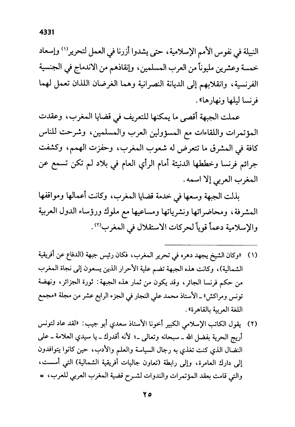 النبيلة في نفوس الأمم الإسلامية، حتى يشدوا أزرنا في العمل لتحرير (¬1) وإسعاد خمسة وعشرين مليوناً من العرب المسلمين، وإنقاذهم من الاندماج في الجنسية الفرنسية، وانقلابهم إلى الديانة النصرانية وهما الغرضان اللذان تعمل لهما فرنسا ليلها ونهارها".
