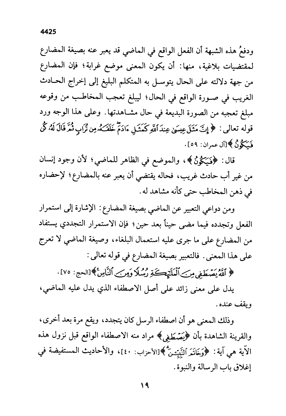 ودفعُ هذه الشبهة أن الفعل الواقع في الماضي قد يعبر عنه بصيغة المضارع لمقتضيات بلاغية، منها: أن يكون المعنى موضع غرابة؛ فإن المضارع من جهة دلالته على الحال يتوسل به المتكلم البليغ إلى إخراج الحادث الغريب في صورة الواقع في الحال؛ ليبلغ تعجب المخاطب من وقوعه مبلغ تعجبه من الصورة البديعة في حال مشاهدتها. وعلى هذا الوجه ورد قوله تعالى: {إِنَّ مَثَلَ عِيسَى عِنْدَ اللَّهِ كَمَثَلِ آدَمَ خَلَقَهُ مِنْ تُرَابٍ ثُمَّ قَالَ لَهُ كُنْ فَيَكُونُ} [آل عمران: 59].