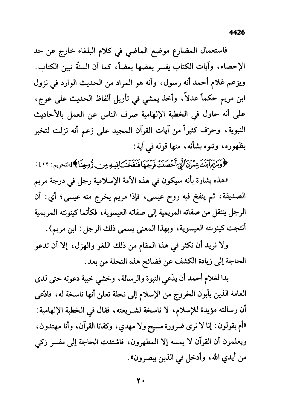 فاستعمال المضارع موضع الماضي في كلام البلغاء خارج عن حد الإحصاء، وًايات الكتاب يفسر بعضها بعضاً، كما أن السنّة تبين الكتاب. ويزعم غلام أحمد أنه رسول، وانه هو المراد من الحديث الوارد في نزول ابن مريم حكماً عدلاً، وأخذ يمشي في تأويل ألفاظ الحديث على عوج، على أنه حاول في الخطبة الإلهامية صرف الناس عن العمل بالأحاديث النبوية، وحرّف كثيراً من آيات القرآن المجيد على زعم أنه نزلت لتخبر بظهوره، وتنوه بشأنه، منها قوله في آية: