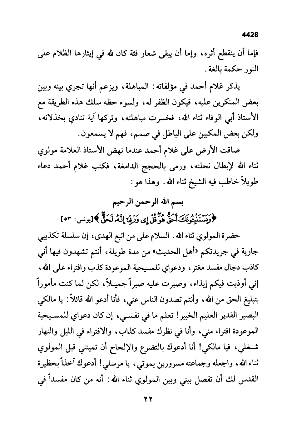 حضرة المولوي ثناء الله. السلام على من اتبع الهدى، إن سلسلة تكذيبي جارية في جريدتكم "أهل الحديث" من مدة طويلة، أنتم تشهدون فيها أني كاذب دجال مفسد مغتر، ودعواي للمسيحية الموعودة كذب وافتراء على الله، إنِّي أوذيت فيكم إيذاء، وصبرت عليه صبراً جميلاً، لكن لما كنت مأموراً بتبليغ الحق من الله، وأنتم تصدون الناس عني، فأنا أدعو الله قائلاً: يا مالكي البصير القدير العليم الخبير! تعلم ما في نفسي، إن كان دعواي للمسيحية الموعودة افتراء مني، وأنا في نظرك مفسد كذاب، والافتراء في الليل والنهار شغلي، فيا مالكي! أنا أدعوك بالتضرع والإلحاح أن تميتني قبل المولوي ثناء الله، واجعله وجماعته مسرورين بموتي، يا مرسلي! أدعوك آخذاً بحظيرة القدس لك أن تفصل بيني وبين المولوي ثناء الله: أنه من كان مفسداً في