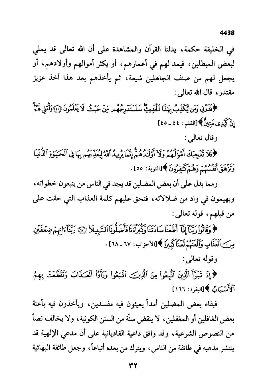 فبقاء بعض المضلين أمداً يعيثون فيه مفسدين، ويأخذون فيه بأعنة بعض الغافلين أو المغفلين، لا ينقض سنّة من السنن الكونية، ولا يخالف نصاً من النصوص الشرعية، وقد وافق داعية القاديانية على أن مدعي الإلهية قد ينتشر مذهبه في طائفة من الناس، ويترك من بعده أتباعاً، وجعل طائفة البهائية