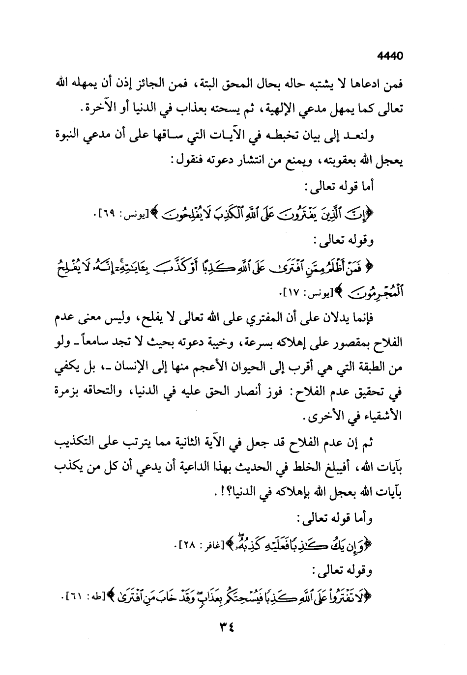 فإنما يدلان على أن المفتري على الله تعالى لا يفلح، وليس معنى عدم الفلاح بمقصور على إهلاكه بسرعة، وخيبة دعوته بحيث لا تجد سامعاً -ولو من الطبقة التي هي أقرب إلى الحيوان الأعجم منها إلى الإنسان-، بل يكفي في تحقيق عدم الفلاح: فوز أنصار الحق عليه في الدنيا، والتحاقه بزمرة الأشقياء في الأخرى.