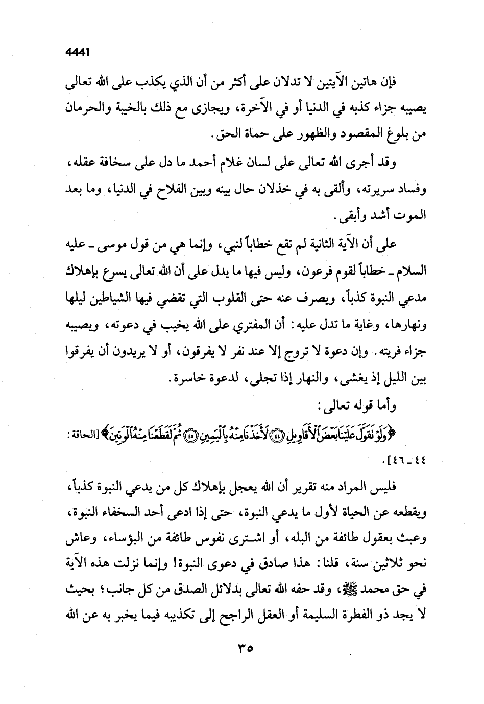 على أن الآية الثانية لم تقع خطاباً لنبي، وإنما هي من قول موسى - عليه السلام - خطاباً لقوم فرعون، وليس فيها ما يدل على أن الله تعالى يسرع بإهلاك مدعي النبوة كذباً، ويصرف عنه حتى القلوب التي تقضي فيها الشياطين ليلها ونهارها، وغاية ما تدل عليه: أن المفتري على الله يخيب في دعوته، ويصيبه جزاء فريته. وإن دعوة لا تروج إلا عند نفر لا يفرقون، أو لا يريدون أن يفرقوا بين الليل إذ يغشى، والنهار إذا تجلى، لدعوة خاسرة.