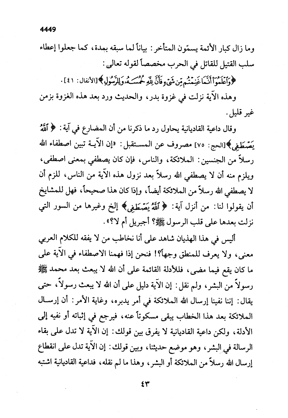 أليس في هذا الهذيان شاهد على أنا نخاطب من لا يفقه للكلام العربي معنى، ولا يعرف للمنطق وجهاً؟! فنحن إذا فهمنا الاصطفاء في الآية على ما كان يقع فيما مضى، فللأدلة القائمة على أن الله لا يبعث بعد محمد - صلى الله عليه وسلم - رسولاً من البشر، ولم نقل: إن الآية دليل على أن الله لا يبعث رسولاً، حتى يقال: إننا نفينا إرسال الله الملائكة في أمر يدبره، وغاية الأمر: أن إرسال الملائكة بعد هذا الخطاب يبقى مسكوتاً عنه، فيرجع في إثباته أو نفيه إلى الأدلة، ولكن داعية القاديانية لا يفرق بين قولك: إن الآية لا تدل على بقاء الرسالة في البشر، وهو موضع حديثنا، وبين قولك: إن الآية تدل على انقطاع إرسال الله رسلاً من الملائكة أو البشر، وهذا ما لم نقله، فداعية القاديانية اشتبه
