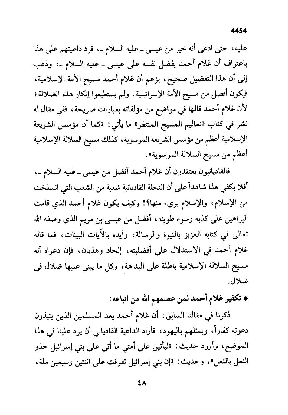 عليه، حتى ادعى أنه خير من عيسى - عليه السلام -، فرد داعيتهم على هذا باعتراف أن غلام أحمد يفضل نفسه على عيسى - عليه السلام -، وذهب إلى أن هذا التفضيل صحيح، بزعم أن غلام أحمد مسيح الأمة الإسلامية، فيكون أفضل من مسيح الأمة الإسرائيلية. ولم يستطيعوا إنكار هذه الضلالة؛ لأن غلام أحمد قالها في مواضع من مؤلفاته بعبارات صريحة، ففي مقال له نشر في كتاب "تعاليم المسيح المنتظر" ما يأتي: "كما أن مؤسس الشريعة الإسلامية أعظم من مؤسس الشريعة الموسوية، كذلك مسيح السلالة الإسلامية أعظم من مسيح السلالة الموسوية".