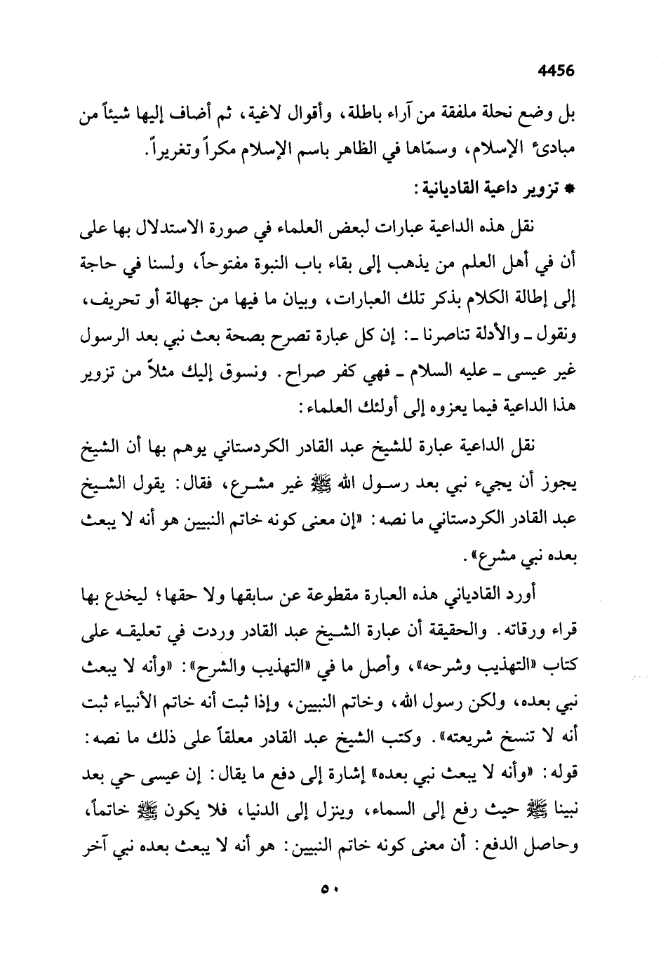 أورد القادياني هذه العبارة مقطوعة عن سابقها ولا حقها؛ ليخدع بها قراء ورقاته. والحقيقة أن عبارة الشيخ عبد القادر وردت في تعليقه على كتاب "التهذيب وشرحه"، وأصل ما في "التهذيب والشرح": "وأنه لا يبعث نبي بعده، ولكن رسول الله، وخاتم النبيين، وإذا ثبت أنه خاتم الأنبياء ثبت أنه لا تنسخ شريعته". وكتب الشيخ عبد القادر معلقاً على ذلك ما نصه: قوله: "وأنه لا يبعث نبي بعده" إشارة إلى دفع ما يقال: إن عيسى حي بعد نبينا - صلى الله عليه وسلم - حيث رفع إلى السماء، وينزل إلى الدنيا، فلا يكون - صلى الله عليه وسلم - خاتماً، وحاصل الدفع: أن معنى كونه خاتم النبيين: هو أنه لا يبعث بعده نبي آخر