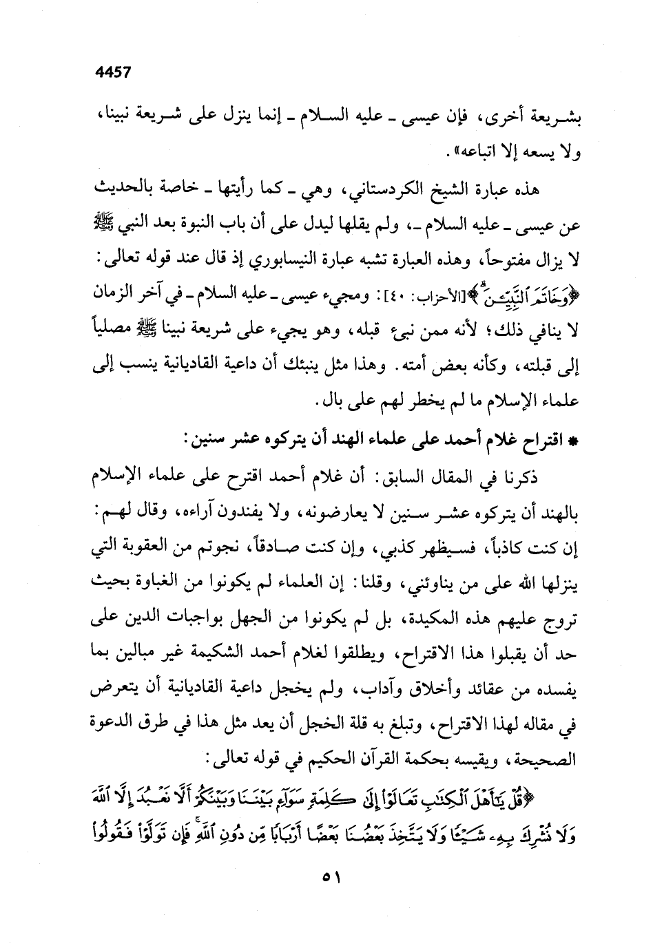 هذه عبارة الشيخ الكردستاني، وهي -كما رأيتها- خاصة بالحديث عن عيسى - عليه السلام -، ولم يقلها ليدل على أن باب النبوة بعد النبي - صلى الله عليه وسلم - لا يزال مفتوحاً، وهذه العبارة تشبه عبارة النيسابوري إذ قال عند قوله تعالى: {وَخَاتَمَ النَّبِيِّينَ} [الأحزاب: 40]: ومجيء عيسى - عليه السلام - في آخر الزمان لا ينافي ذلك؛ لأنه ممن نبئ قبله، وهو يجيء على شريعة نبينا - صلى الله عليه وسلم - مصلياً إلى قبلته، وكأنه بعض أمته. وهذا مثل ينبئك أن داعية القاديانية ينسب إلى علماء الإسلام ما لم يخطر لهم على بال.