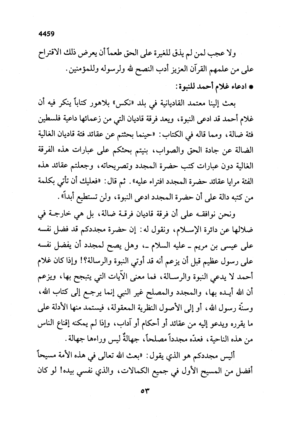 ونحن نوافقه على أن فرقة قاديان فرقة ضالة، بل هي خارجة في ضلالها عن دائرة الإسلام، ونقول له: إن حضرة مجددكم قد فضل نفسه على عيسى بن مريم - عليه السلام -، وهل يصح لمجدد أن يفضل نفسه على رسول عظيم قبل أن يزعم أنه قد أوتي النبوة والرسالة؟! وإذا كان غلام أحمد لا يدعي النبوة والرسالة، فما معنى الآيات التي يتبجح بها، ويزعم أن الله أيده بها، والمجدد والمصلح غير النبي إنما يرجع إلى كتاب الله، وسنّة رسول الله، أو إلى الأصول النظرية المعقولة، فيستمد منها الأدلة على ما يقرره ويدعو إليه من عقائد أو أحكام أو آداب، وإذا لم يمكنه إقناع الناس من هذه الناحية، فعدّه مجدداً مصلحاً، جهالةٌ ليس وراءها جهالة.