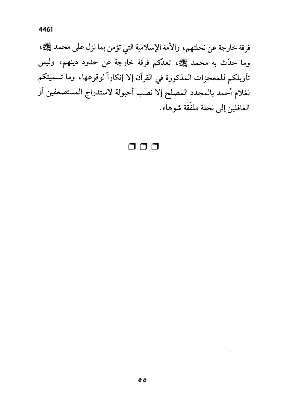 فرقة خارجة عن نحلتهم، والأمة الإسلامية التي تؤمن بما نزل على محمد - صلى الله عليه وسلم -، وما حدّث به محمد - صلى الله عليه وسلم -، تعدّكم فرقة خارجة عن حدود دينهم، وليس تأويلكم للمعجزات المذكورة في القرآن إلا إنكاراً لوقوعها، وما تسميتكم لغلام أحمد بالمجدد المصلح إلا نصب أحبولة لاستدراج المستضعفين أو الغافلين إلى نحلة ملفّقة شوهاء.
