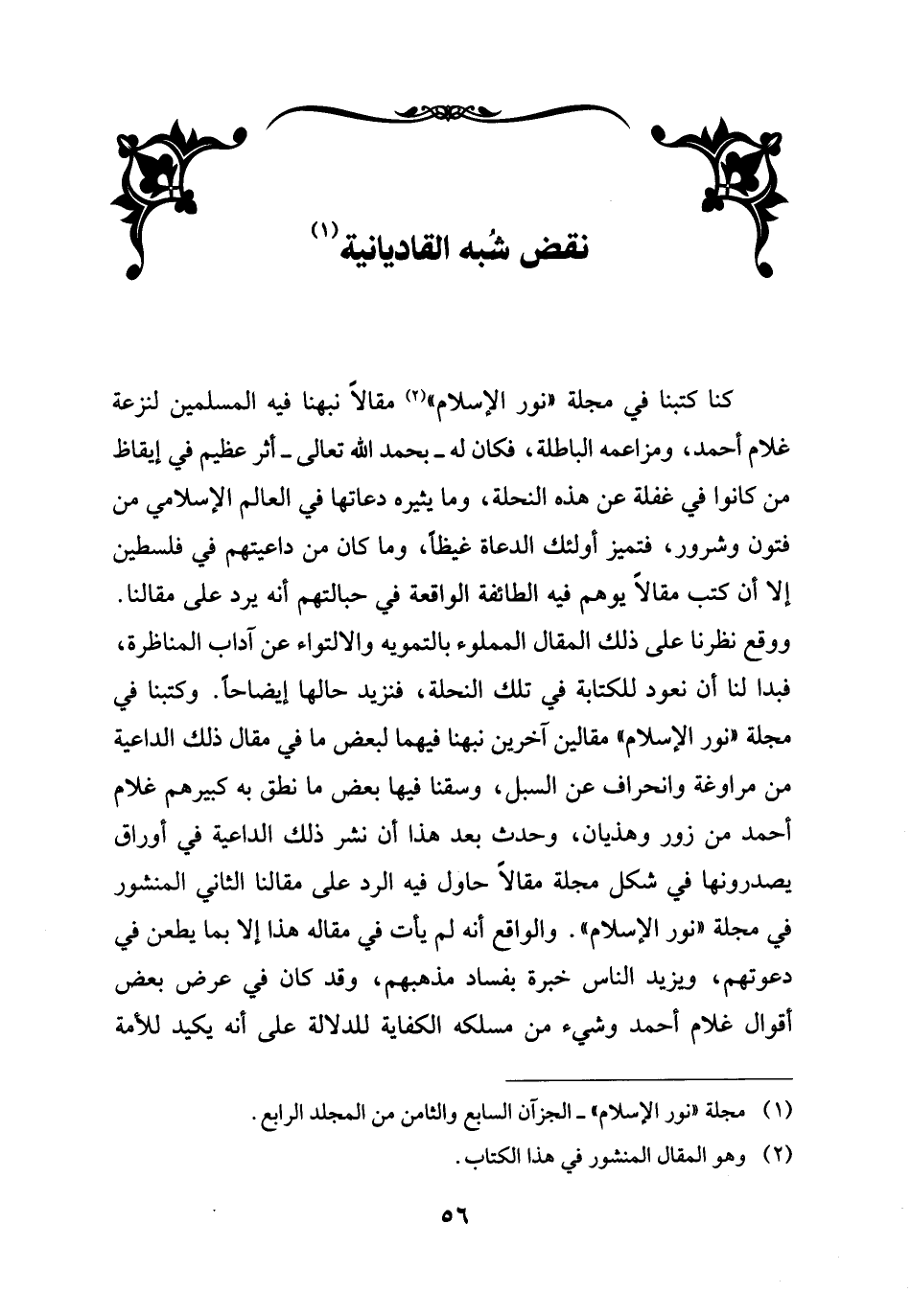 كنا كتبنا في مجلة "نور الإسلام" (¬2) مقالاً نبهنا فيه المسلمين لنزعة غلام أحمد، ومزاعمه الباطلة، فكان له - بحمد الله تعالى- أثر عظيم في إيقاظ من كانوا في غفلة عن هذه النحلة، وما يثيره دعاتها في العالم الإسلامي من فتون وشرور، فتميز أولئك الدعاة غيظاً، وما كان من داعيتهم في فلسطين إلا أن كتب مقالاً يوهم فيه الطائفة الواقعة في حبالتهم أنه يرد على مقالنا. ووقع نظرنا على ذلك المقال المملوء بالتمويه والالتواء عن آداب المناظرة، فبدا لنا أن نعود للكتابة في تلك النحلة، فنزيد حالها إيضاحاً. وكتبنا في مجلة "نور الإسلام" مقالين آخرين نبهنا فيهما لبعض ما في مقال ذلك الداعية من مراوغة وانحراف عن السبل، وسقنا فيها بعض ما نطق به كبيرهم غلام أحمد من زور وهذيان، وحدث بعد هذا أن نشر ذلك الداعية في أوراق يصدرونها في شكل مجلة مقالاً حاول فيه الرد على مقالنا الثاني المنشور في مجلة "نور الإسلام". والواقع أنه لم يأت في مقاله هذا إلا بما يطعن في دعوتهم، ويزيد الناس خبرة بفساد مذهبهم، وقد كان في عرض بعض أقوال غلام أحمد وشيء من مسلكه الكفاية للدلالة على أنه يكيد للأمة