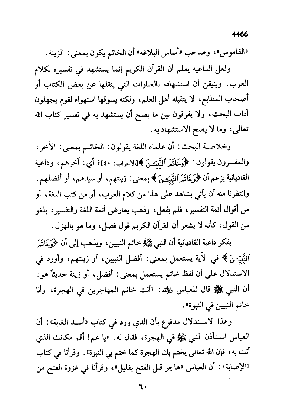 يفكر داعية القاديانية أن النبي - صلى الله عليه وسلم - خاتم النبيين، ويذهب إلى أن {وَخَاتَمَ النَّبِيِّينَ} في الآية يستعمل بمعنى: أفضل النبيين، أو زينتهم، وأورد في الاستدلال على أن لفظ خاتم يستعمل بمعنى: أفضل، أو زينة حديثاً هو: أن النبي - صلى الله عليه وسلم - قال للعباس - رضي الله عنه -: "أنت خاتم المهاجرين في الهجرة، وأنا خاتم النبيين في النبوة".