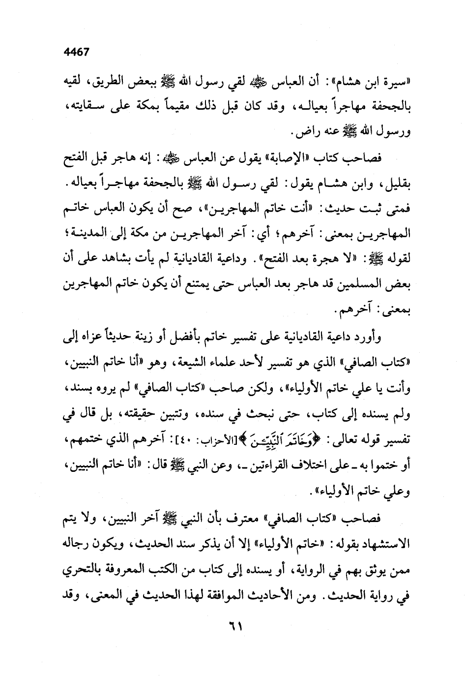 فصاحب كتاب "الإصابة" يقول عن العباس - رضي الله عنه -: إنه هاجر قبل الفتح بقليل، وابن هشام يقول: لقي رسول الله - صلى الله عليه وسلم - بالجحفة مهاجراً بعياله. فمتى ثبت حديث: "أنت خاتم المهاجرين"، صح أن يكون العباس خاتم المهاجرين بمعنى: آخرهم؛ أي: آخر المهاجرين من مكة إلى المدينة؛ لقوله - صلى الله عليه وسلم -: "لا هجرة بعد الفتح". وداعية القاديانية لم يأت بشاهد على أن بعض المسلمين قد هاجر بعد العباس حتى يمتنع أن يكون خاتم المهاجرين بمعنى: آخرهم.