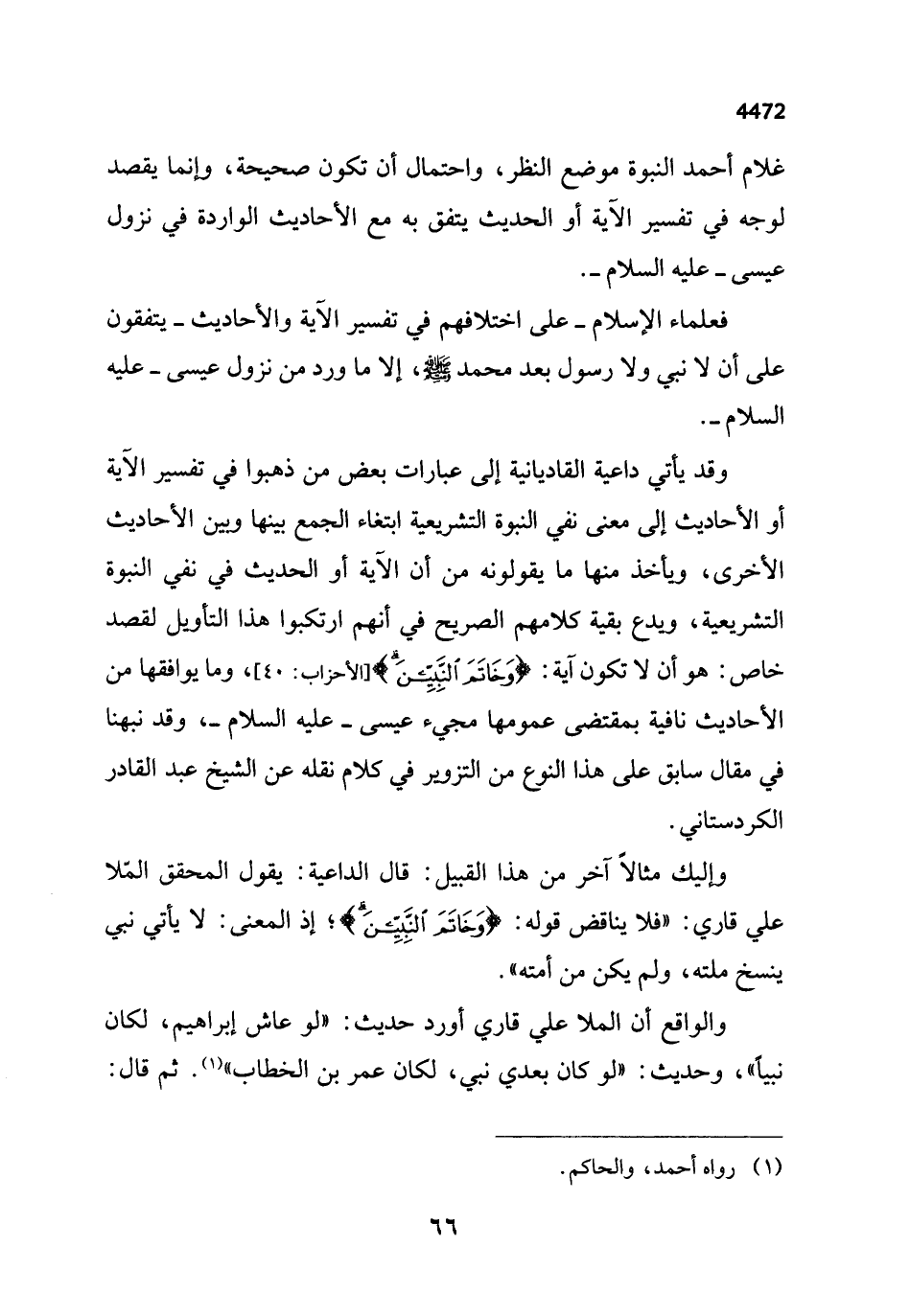 وإليك مثالاً آخر من هذا القبيل: قال الداعية: يقول المحقق الملّا علي قاري: "فلا يناقض قوله: {وَخَاتَمَ النَّبِيِّينَ}؛ إذ المعنى: لا يأتي نبي ينسخ ملته، ولم يكن من أمته".