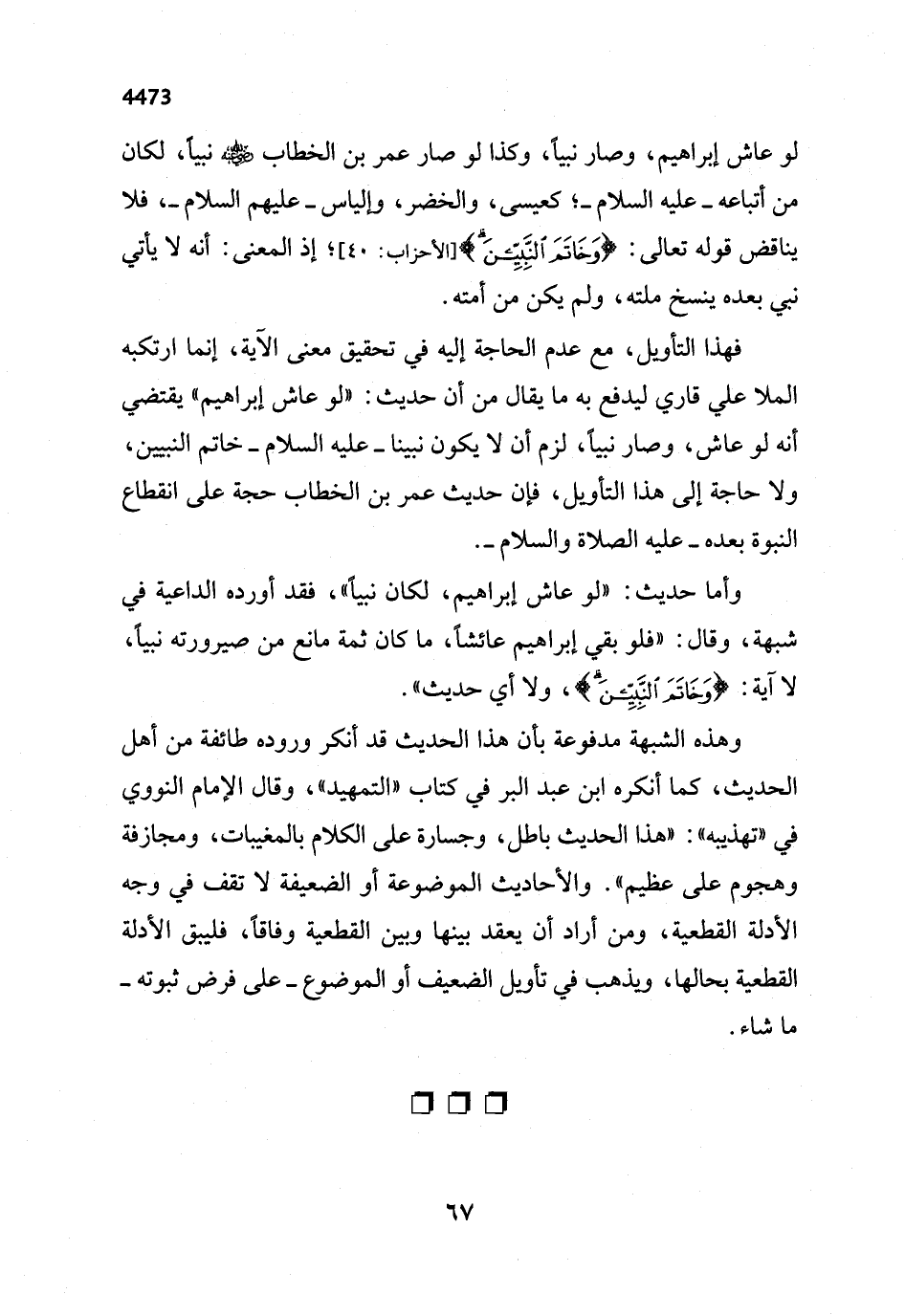 فهذا التأويل، مع عدم الحاجة إليه في تحقيق معنى الآية، إنما ارتكبه الملا علي قاري ليدفع به ما يقال من أن حديث: "لو عاش إبراهيم" يقتضي أنه لو عاش، وصار نبياً، لزم أن لا يكون نبينا - عليه السلام - خاتم النبيين، ولا حاجة إلى هذا التأويل، فإن حديث عمر بن الخطاب حجة على انقطاع النبوة بعده - عليه الصلاة والسلام -.