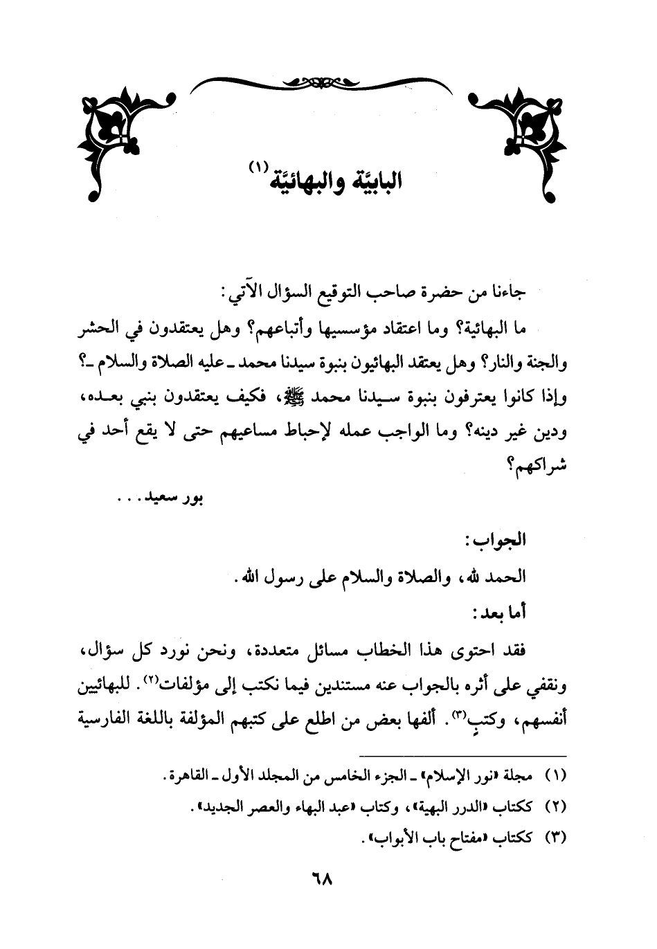 فقد احتوى هذا الخطاب مسائل متعددة، ونحن نورد كل سؤال، ونقفي على أثره بالجواب عنه مستندين فيما نكتب إلى مؤلفات (¬2). للبهائيين أنفسهم، وكتبٍ (¬3). ألفها بعض من اطلع على كتبهم المؤلفة باللغة الفارسية