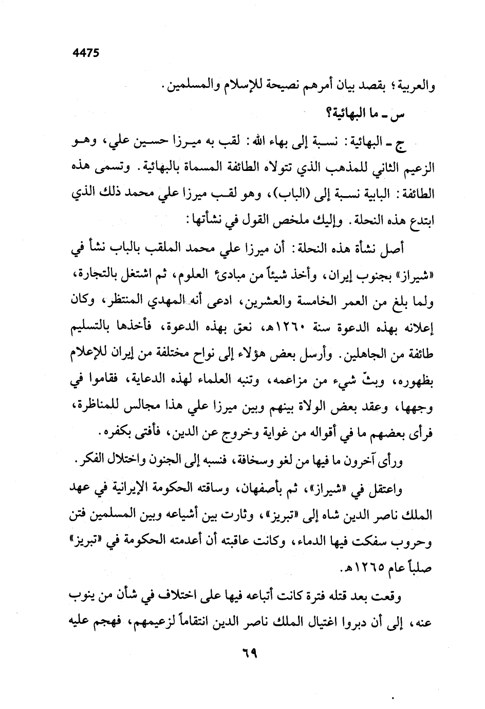ج - البهائية: نسبة إلى بهاء الله: لقب به ميرزا حسين علي، وهو الزعيم الثاني للمذهب الذي تتولاه الطائفة المسماة بالبهائية. وتسمى هذه الطائفة: البابية نسبة إلى (الباب)، وهو لقب ميرزا علي محمد ذلك الذي ابتدع هذه النحلة. وإليك ملخص القول في نشأتها: