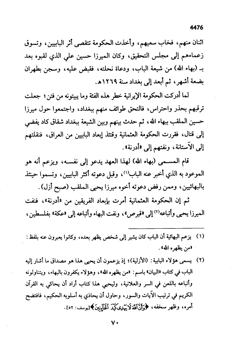 (¬2) يسمى هؤلاء البابية: (الأزلية)؛ إذ يزعمون أن يحيى هذا هو مصداق ما أشار إليه الباب في كتاب "البيان" باسم: "من يظهره الله"، وهؤلاء يكفرون بالبهاء، ويتناولونه وأتباعه باللعن في السر والعلانية، وليحيي هذا كتاب أراد أن يحاكي به القرآن الكريم في ترتيب الآيات والسور، وحاول أن يحاذي به أسلوبه الحكيم، فافتضح أمره، وظهر سخفه، {وَأَنَّ اللَّهَ لَا يَهْدِي كَيْدَ الْخَائِنِينَ} [يوسف: 52].