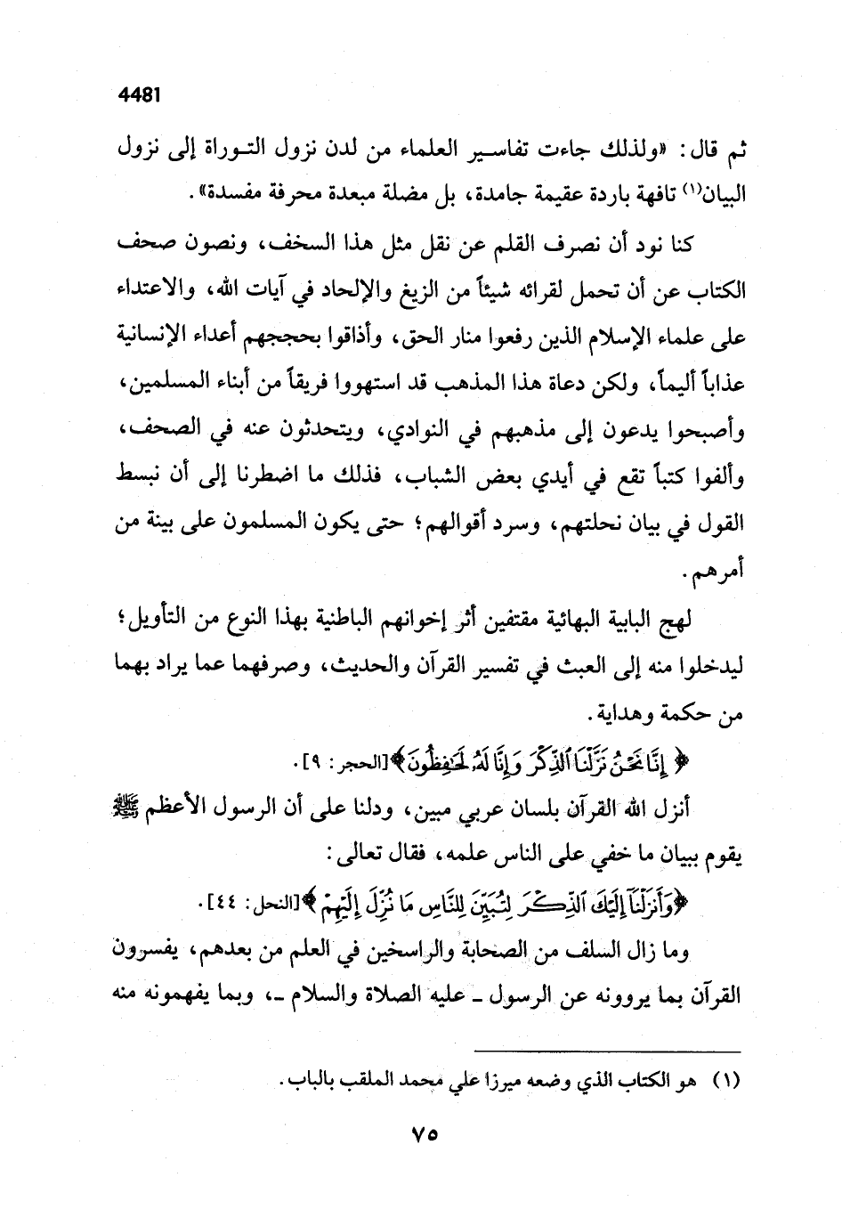 كنا نود أن نصرف القلم عن نقل مثل هذا السخف، ونصون صحف الكتاب عن أن تحمل لقرائه شيئاً من الزيغ والالحاد في آيات الله، والاعتداء على علماء الإسلام الذين رفعوا منار الحق، وأذاقوا بحججهم أعداء الإنسانية عذاباً أليماً، ولكن دعاة هذا المذهب قد استهووا فريقاً من أبناء المسلمين، وأصبحوا يدعون إلى مذهبهم في النوادي، ويتحدثون عنه في الصحف، وألفوا كتباً تقع في أيدي بعض الشباب، فذلك ما اضطرنا إلى أن نبسط القول في بيان نحلتهم، وسرد أقوالهم؛ حتى يكون المسلمون على بينة من أمرهم.
