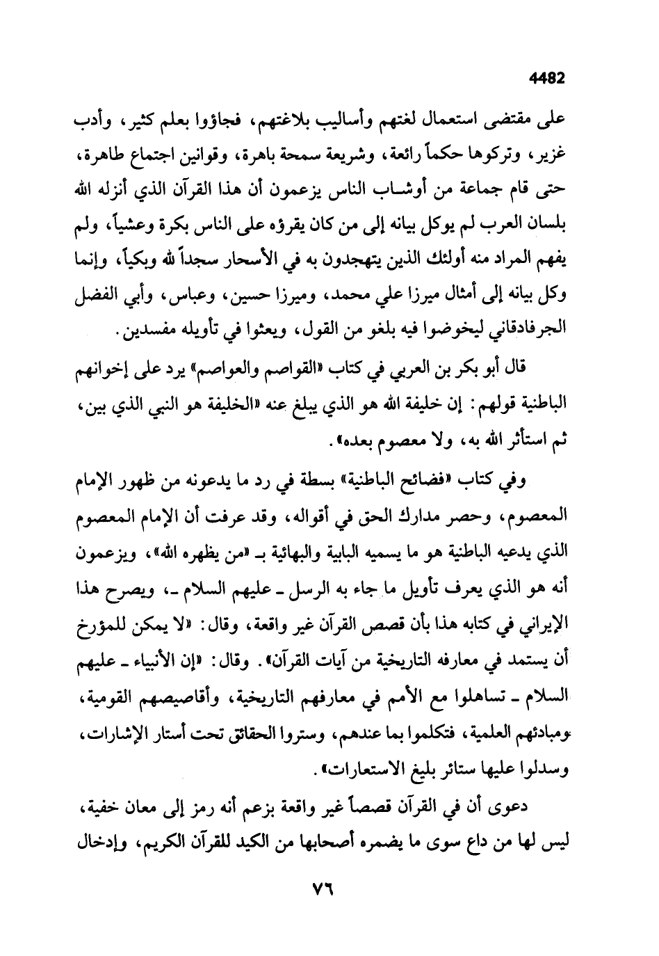 وفي كتاب "فضائح الباطنية" بسطة في رد ما يدعونه من ظهور الإمام المعصوم، وحصر مدارك الحق في أقواله، وقد عرفت أن الإمام المعصوم الذي يدعيه الباطنية هو ما يسميه البابية والبهائية بـ"من يظهره الله"، ويزعمون أنه هو الذي يعرف تأويل ما جاء به الرسل - عليهم السلام -، ويصرح هذا الإيراني في كتابه هذا بأن قصص القرآن غير واقعة، وقال: "لا يمكن للمؤرخ أن يستمد في معارفه التاريخية من آيات القرآن". وقال: "إن الأنبياء - عليهم السلام - تساهلوا مع الأمم في معارفهم التاريخية، وأقاصيصهم القومية، ومبادئهم العلمبة، فتكلموا بما عندهم، وستروا الحقائق تحت أستار الإشارات، وسدلوا عليها ستائر بليغ الاستعارات".
